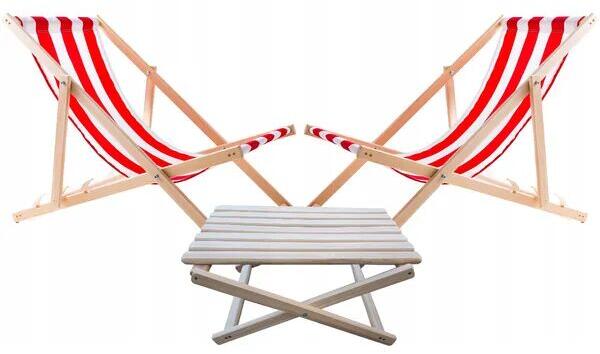 2 db piros csíkos, bükkfa vázas összecsukható napozóágy + kisasztal szett