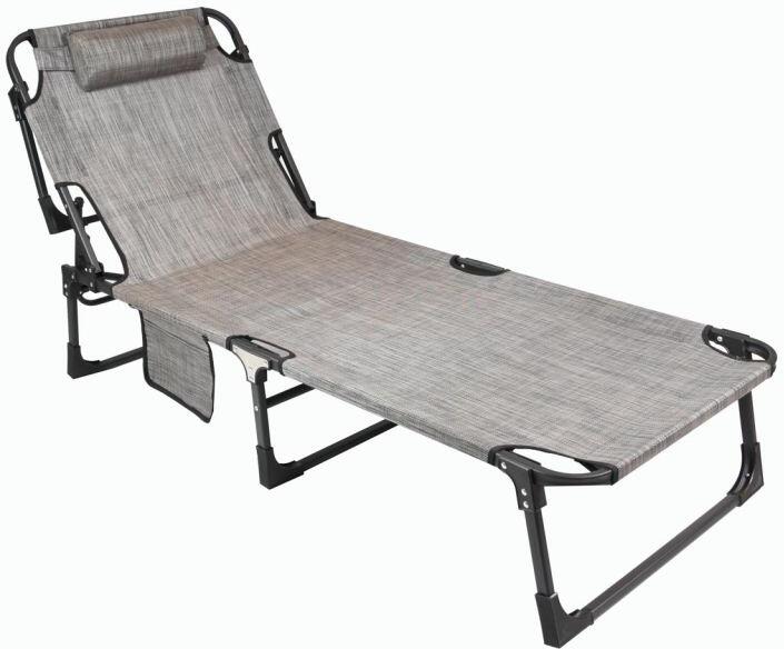 Összecsukható alumínium nyugágy, amely 4 pozícióban állítható az optimális, pihentető fekvő- és ülőhelyzethez. A váz szürkére festett acélból, a huzat szürke poliészterből, a lábak pedig tömör acélból készültek. A nyugágy időjárásálló és alacsony karbantartási igényű. Anyaga puha és alkalmazkodik a testhez. A nyugágy maximális rugalmasságot kínál, praktikus, kényelmes, stabil, robusztus, könnyű és tartós. Különösen nyáron gyakran használt bútordarab a kertben, a teraszon vagy kempingezéskor. Termék részletek: