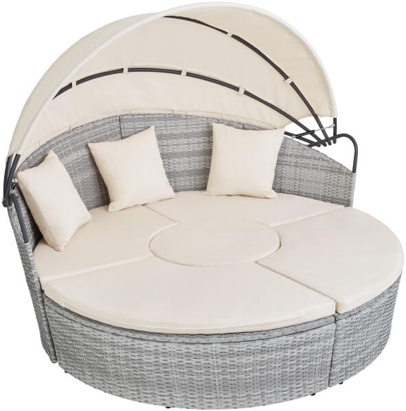 A kombinálható kerti rattan bútor, az átgondolt tervezésének köszönhetően nagyon sokoldalú. A kör alakú rattan heverő széthúzásával pár másodperc alatt egy praktikus ülő garnitúrát kapunk, amely egy két személyes tetős fotelből, két különálló ülőből és egy kör alakú asztalból áll. A pozicionálható tető kellemes árnyékot ad, védelmet nyújt a napsugarak és szél ellen. Ez a kerti heverő ideális választás a pihenéshez, vagy kellemes pillanatok eltöltéséhez baráti körben. Alkalmas kertbe, erkélyre, teraszra, vagy a strandra. Egyszerű karbantartása és a használt anyagok hosszú élettartama miatt alkalmas hotelek, wellness központok, gyógyfürdők berendezésére.