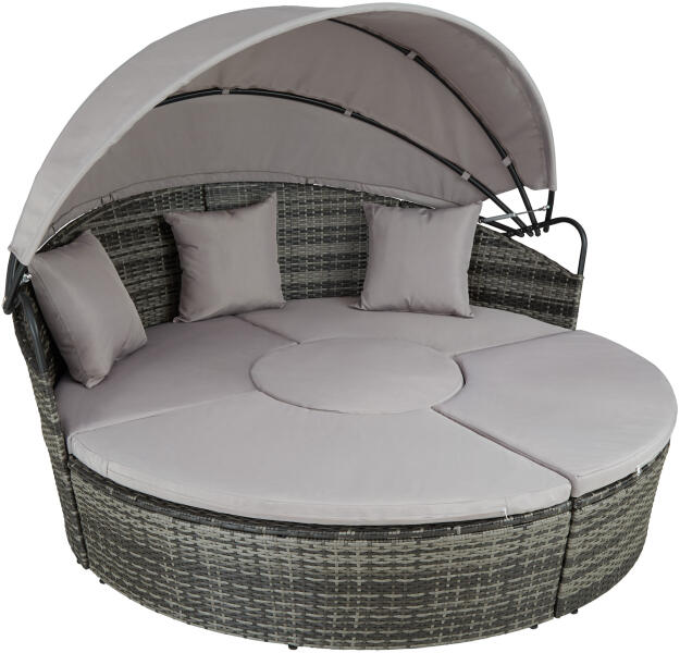 A Santorin rattan kerti bútorkészlet jellemzői az elegáns dizájn és a magas kényelem ülésnél és fekvésnél egyaránt. A kombinálható elemek vízlepergető párnákkal többrészes ülőgarnitúraként, vagy akár egy nagy ágyként is használható. A robosztus árnyékoló tető meleg és szél ellen biztosít védelmet és tépőzárak tartják a helyén. Minőségi műrattanból készült fonott anyag és a masszív acél váz a kényelem oázisává teszik a Santorin sokoldalú bútorszigetet.